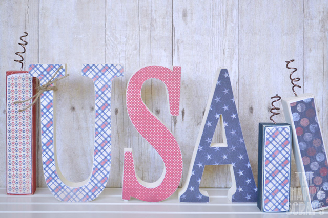 Five or six years ago, I made me some USA letters, using paper mache letters from Joann’s. Last year, I decided that I wanted to update/replace them, so I picked up some wood letters. I didn’t get them finished last year, so they were at the top of my list for this year. I don’t know why I didn’t get them done last year, they were SO quick.